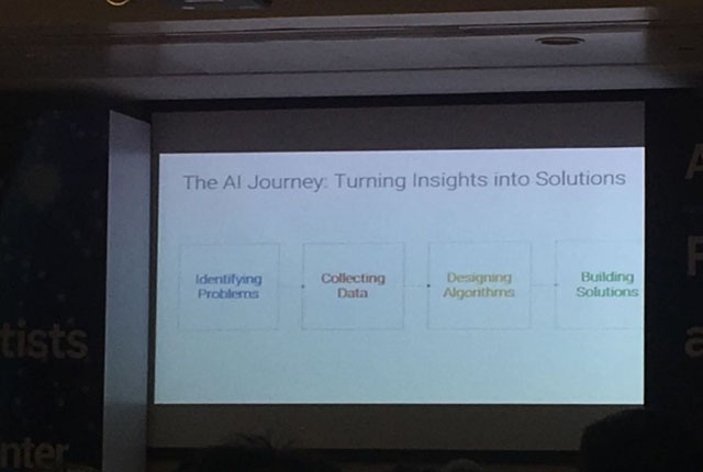 另外,在現場,Google Cloud 人工智能部門負責人李佳博士做了一個關于 AI Journey 的演講,內容主題是將想法變成解決方案的過程,這是李佳博士第一次使用中文演講。在演講中,李佳博士的核心觀點是,要想通過 AI 解決問題,要經歷認知問題(Identifying Problems)、搜集數據(Collecting Data)、構造算法(Designing Algorthms)、創建解決方案(Building Solutions)等四個步驟。