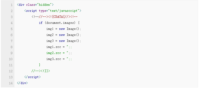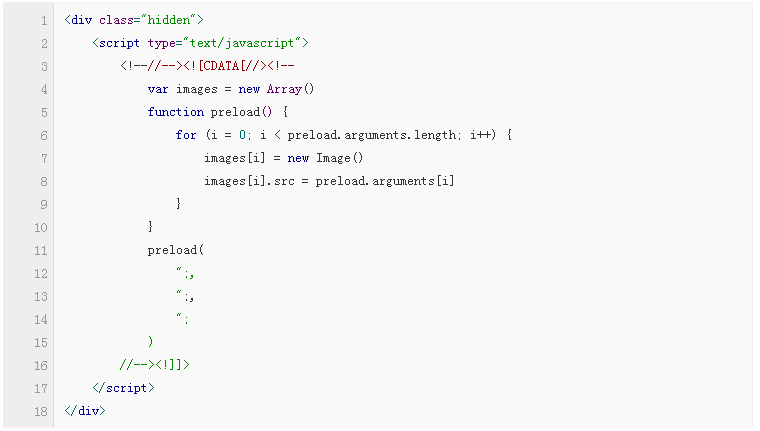 該方法雖然高效,但仍有改進(jìn)余地。使用該法加載的圖片會同頁面的其他內(nèi)容一起加載,增加了頁面的整體加載時間。為了解決這個問題,我們增加了一些JavaScript代碼,來推遲預(yù)加載的時間,直到頁面加載完畢。代碼如下: