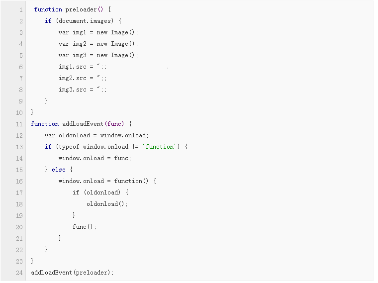 我們又對該方法進(jìn)行了改進(jìn)。將該腳本封裝入一個函數(shù)中,并使用 addLoadEvent(),延遲預(yù)加載時間,直到頁面加載完畢。