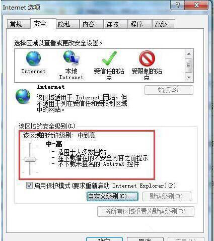 2、點擊“安全”進入“Internet”點擊“自定義級別”。如圖所示: