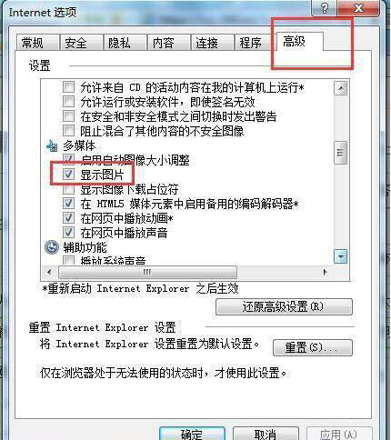 6、在Internet選項中點擊“高級”勾選“顯示圖片”后確定。如圖所示:
