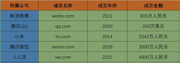 2000年,騰訊QQ為了擁有qq.com的域名,花費(fèi)了200萬美元;2011年,新浪微博為了獲得weibo.com的域名所有權(quán),也付出了800萬人民幣;2014年,小米也是花了2243萬人民幣才購買到mi.com的域名;2015年,人人貸為了we.com的域名更是花了4880萬的天價。同年還有360公司更為為了獲得360.com的域名,出了1億人民幣的天價!加上2016年,騰訊微信為了購買weixin.com,都提出了訴訟仲裁,幾經(jīng)周折還是付出了3000萬人民幣的代價。此外還有國外互聯(lián)網(wǎng)公司的購買案例,我就不一一列舉了,直接看下圖吧: