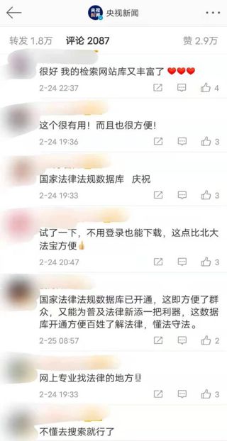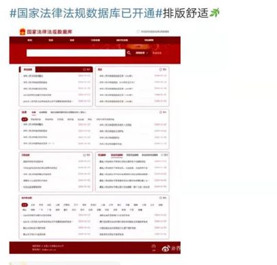 有網(wǎng)友直呼這是“法律檢索網(wǎng)站的國(guó)家隊(duì)來了” “大大方便了普通人對(duì)法律法規(guī)的檢索需求”,還有網(wǎng)友感慨,“這個(gè)數(shù)據(jù)庫太逆天了” “終于不用去某法寶上花錢看最新、最準(zhǔn)確的法律內(nèi)容了”。