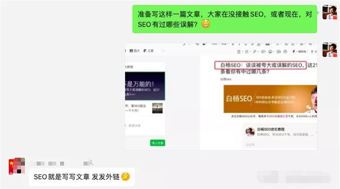 為什么為有這個(gè)認(rèn)為呢,因?yàn)槲页俗约汗娞?hào)、博客以及自媒體發(fā)布后,受一些第三方知名媒體轉(zhuǎn)載,所以每天都有5-10人加過(guò)來(lái)。之前有個(gè)人加過(guò)來(lái)問(wèn)我,說(shuō)白楊老師,你收徒弟嗎,跟你學(xué)會(huì)SEO是不是就可以賺錢了?我回復(fù)說(shuō),一則我不再網(wǎng)上收徒,二則SEO學(xué)會(huì)了不等于賺錢,我也不會(huì)賺錢,怎么教你賺錢呢?