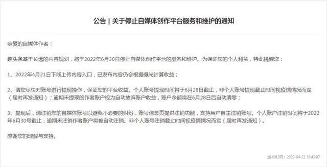 公告稱,趣頭條基于長遠的內容規劃,將于2022年6月30日停止自媒體創作平臺的服務和維護。