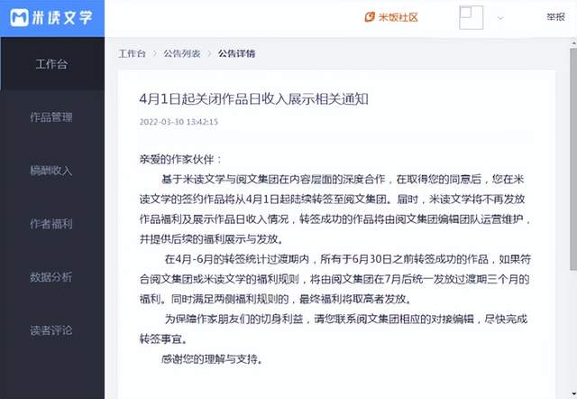 今年3月底,米讀在作者后臺發布公告,宣布4月1日起關閉作品日收入展示,在取得作者同意后米讀的簽約作品將陸續轉簽至閱文集團,后續也將由閱文進行運營維護。