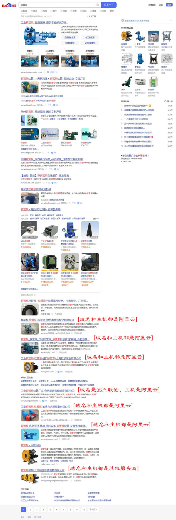 從上圖我們可以看到百度“軟管泵”這個詞,自然排名首頁的7家公司,有6家用的都是阿里云產品(其中只有一家域名是35互聯的)。當然,我們不能說用了阿里的產品就能做好關鍵詞排名,小編只是想說關于域名和主機這塊阿里云還是相對最穩定的,當然價格也是最高的。一般企業網站想購買比官網價格低的產品可電話咨詢:15339698279(何經理)。
