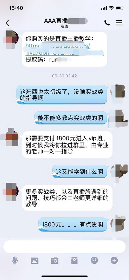 另一家號稱已培訓出幾千名成功主播的培訓代理所收學費為2688元,其在解釋“為何學費如此貴”時,表示該機構遠比其他同行更為專業,所教導的東西都是實戰性強的。但在記者提出能否“先試聽再付費”,以及觀看旗下成功主播的直播現場時,對方遲遲沒有回答,僅是不斷要求記者付款后進入VIP群中學習。