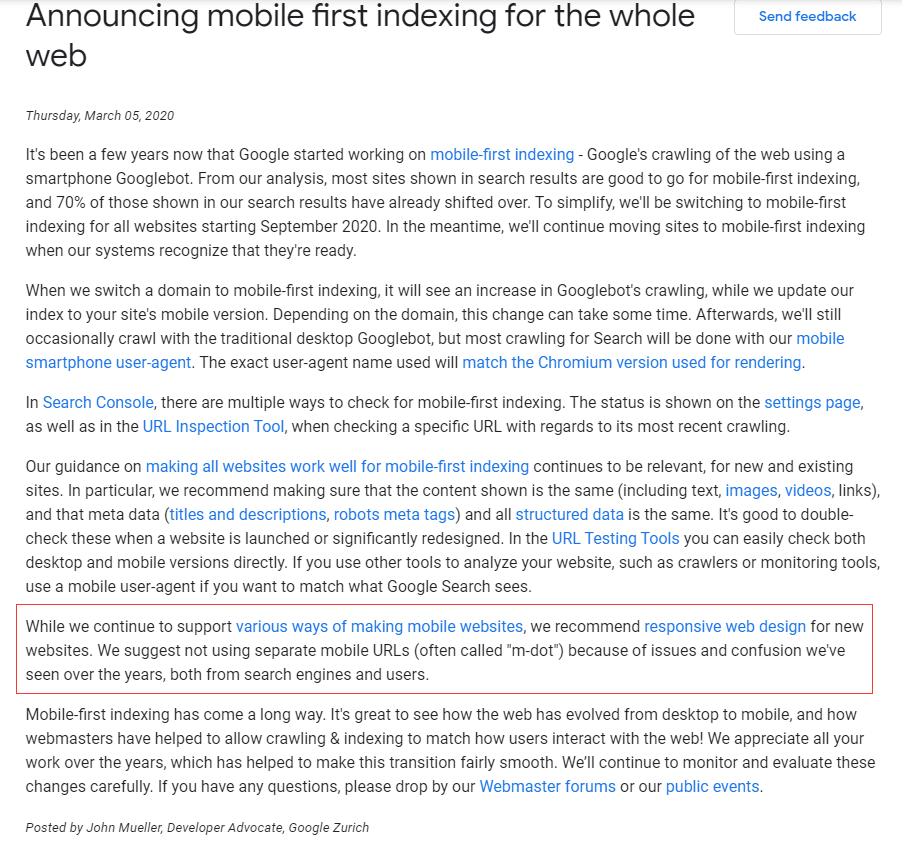 實際上,早在2018年8月,谷歌就明確建議在網(wǎng)站建設中使用響應式自適應技術,并提出了6個理由: