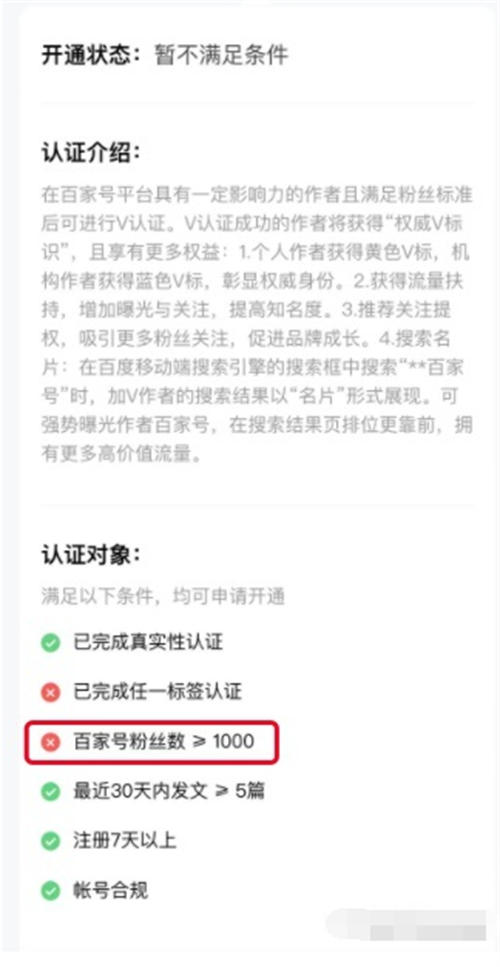 比如上圖是我教程百家號認(rèn)證提示,要滿足1000粉絲(當(dāng)然,前面百家號站外優(yōu)化說過有人+粉之類,哈哈哈)。所以,我就不用賬號參與排名,主要做百家號文章排名。