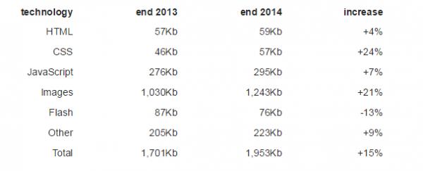 CSS增加了11Kb,響應性網頁設計和CSS3應該對這一增加出了不少力,但JavaScript卻沒有減少。雖然現在有不少CSS管理和精減工具,但每個網站都會平均請求6個CSS文件。